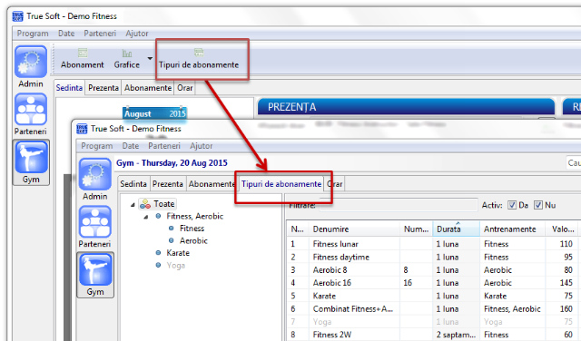Începând cu versiunea 8.2 a programului, tipurile de abonamente nu mai sunt afișate într-o fereastră separată, ci direct în aplicație, cu posibilitate de filtrare după antrenamente, durată sau criterii configurate de utilizator. A fost eliminată și bara de butoane din partea superioară, operația de adăugare abonament fiind posibilă din câmpul de căutare, iar graficele din meniul principal, de la "Date" → "Grafice".