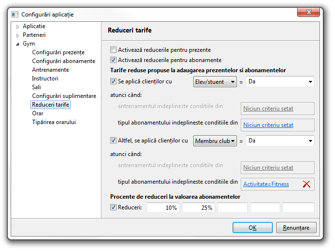 Se pot defini reduceri atat pentru valoarea abonamentelor cat si pentru plata la sedinta. Criteriile de testare se stabilesc in ecranul de configurare al aplicatiei: