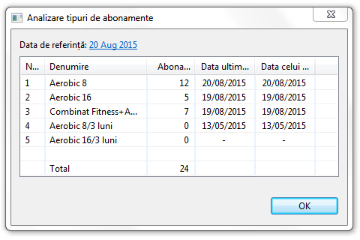 O operație utilă este "Analizare tipuri de abonamente". Pentru tipurile de abonamente selectate, se poate afla câte abonamente sunt valabile la o dată anume, precum si data ultimului abonament încheiat.