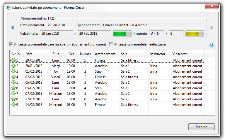 Programul va afișa un abonament că este consumat doar dacă numărul ședințelor limitate (Aerobic în exemplul de mai sus) trece de limita stabilită. În imaginea alăturată, la istoricul activității pe abonament, se observă cum numerotarea prezentelor este separată.