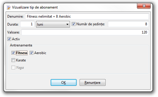 Selecția antrenamentelor este disponibilă în fereastra de editare a tipului de abonament: