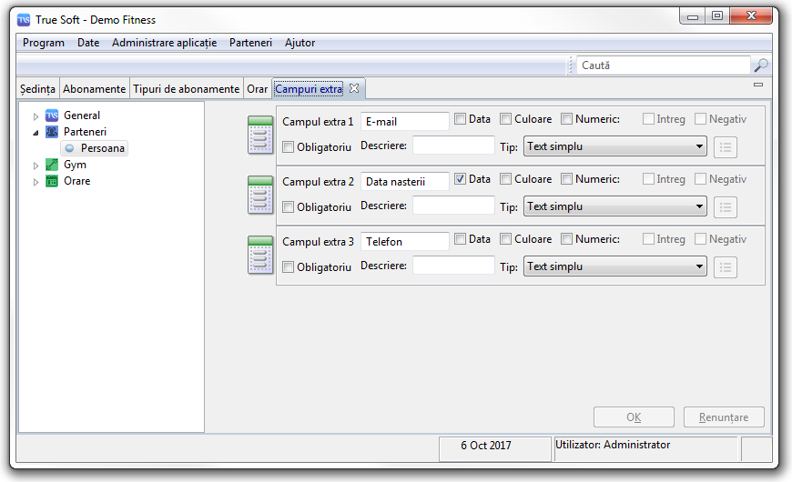Câmpurile extra pot fi numerice, alfanumerice, de tip data (ex: „13/06/1991”). Introducerea datelor poate fi facuta prin campuri de editare, campuri de tip combo-box (cu liste), butoane radio, sau campuri numerice de tip spinner. In figura alaturata sunt exemplificate 4 campuri extra de diferite tipuri. Numarul câmpurilor extra care se pot defini in aplicatie este nelimitat.