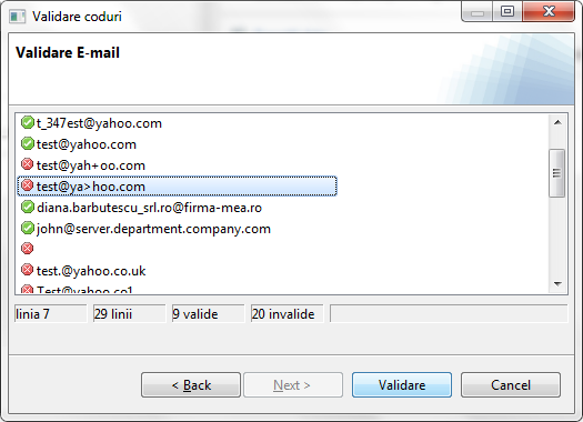 Permite validarea unor texte care au un format anume sau care conțin cifre de corecție. Se determina dacă valorile introduse sunt corecte. Se pot valida liste formate din: coduri numerice personale, coduri de identificare fiscala, conturi IBAN, e-mail-uri, adrese de Internet sau coduri de bare.