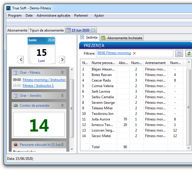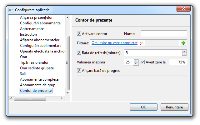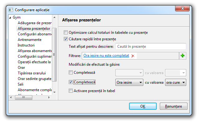 Se poate completa, opțional, ora de intrare și de ieșire a clientului. În câmpul de căutare în prezențe se selecteaza cei care vor pleca din sală. Dacă clienții au legitimații cu coduri de bare, înregistrarea se poate face doar cu o scanare a legitimației.