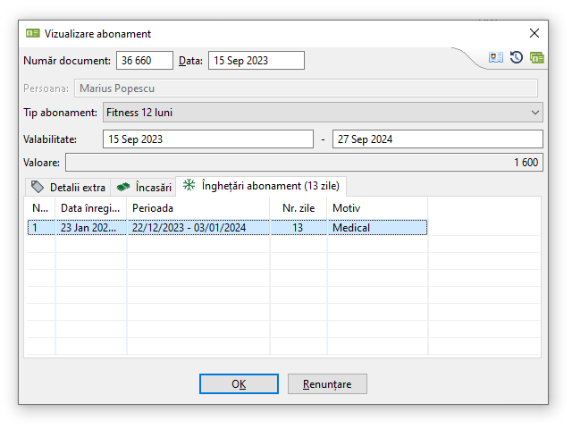 Modulul permite ”înghețarea” abonamentelor - mai exact adăugarea unor perioade pentru care abonamentul este suspendat, iar apoi se prelungește valabilitatea cu un număr de zile egal cu cel din perioada de suspendare.