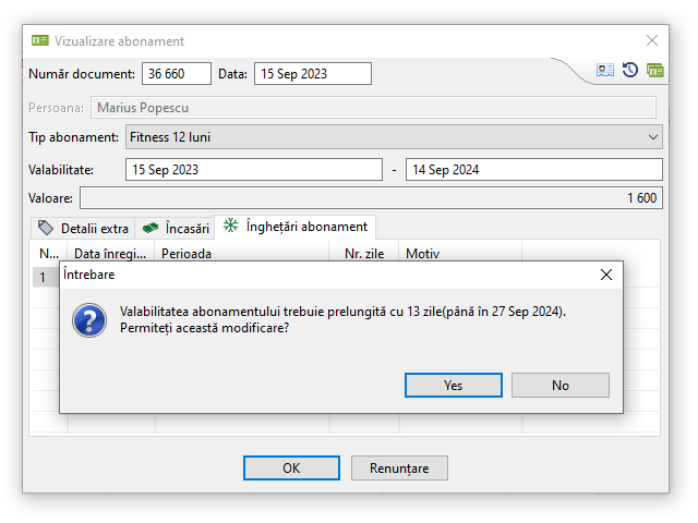 Apoi, la cererea clientului, se adaugă câte o perioadă de fiecare dată când el nu poate beneficia de abonament. În acest interval, programul nu va permite înregistrarea de prezențe pe acest abonament(va fi ca și cum clientul nu ar avea abonament valid). Valabilitatea abonamentului se va prelungi automat cu numărul de zile suspendate, iar acest lucru va fi luat în calcul si la rapoartele făcute de modulul Analiză și grafice.