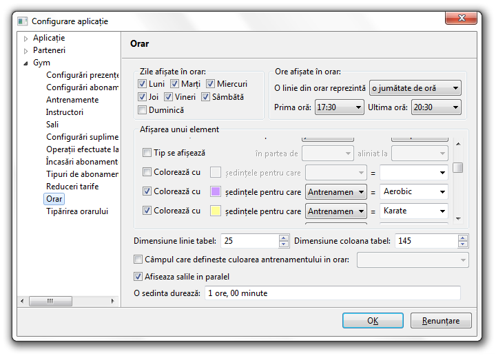 Se pot configura zilele si orele care se vor afisa, unde sa fie pozitionate textele din cadrul unui curs si modul in care elemente sa fie colorate (in functie de antrenamente/instructori/săli sau alte date ale cursului).