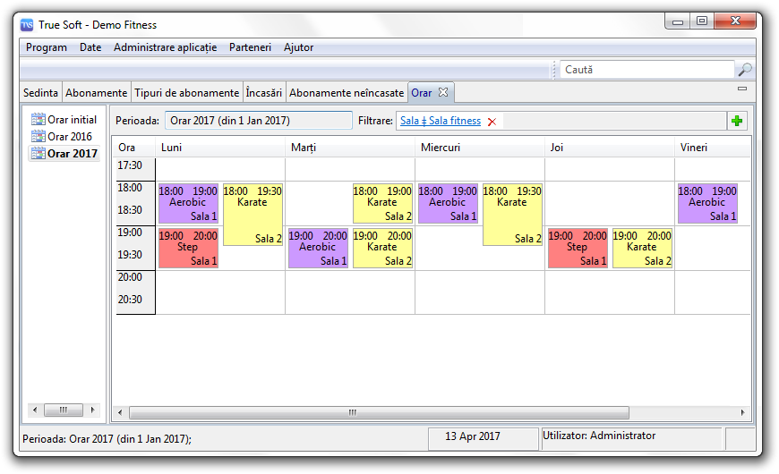 Cu ajutorul acestui modul se defineşte orarul clubului. Pe baza acestuia, programul va propune la înregistrarea prezentelor aceste date ale sedintelor.